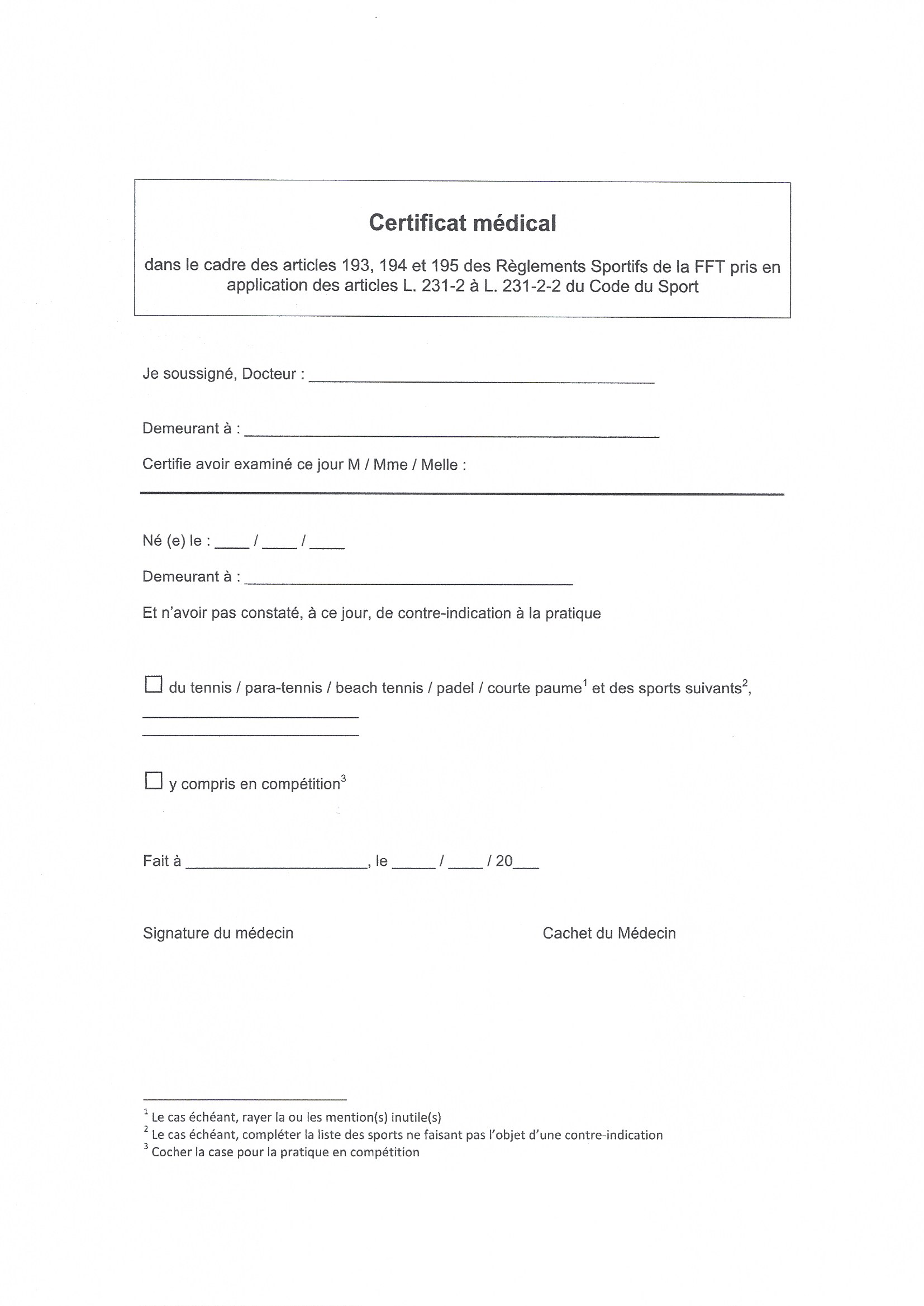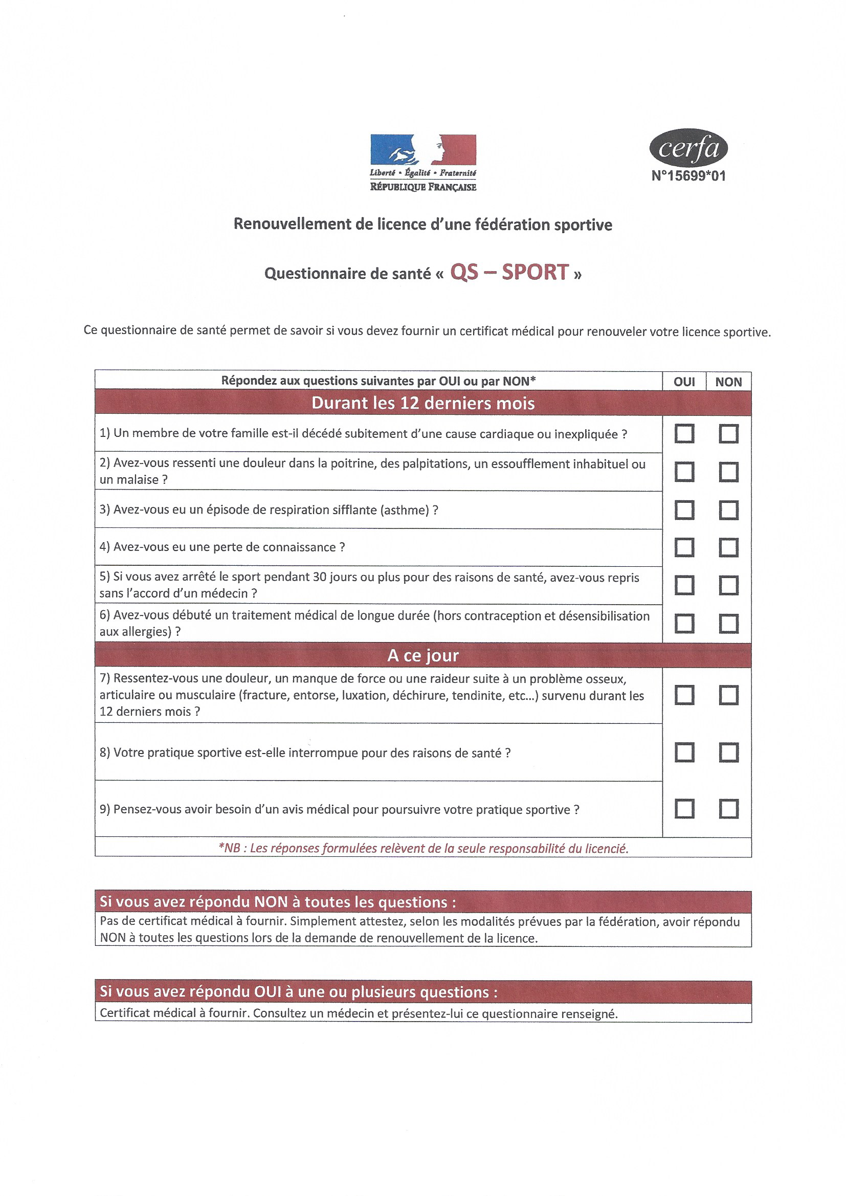 Vous trouverez ci-joints la fiche d'inscription ansi que le questionnaire de santé à remplir pour le renouvellement de la licence, ainsi qu'un modèle de certificat médical.